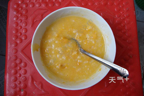 4、红薯泥放入白米粥中,搅拌均匀即可。