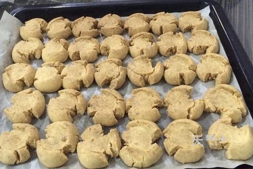 6、取出冷藏好的面团,取一小块,揉成小圆球,将小圆球放在烤盘上,用大拇指按扁;