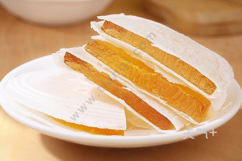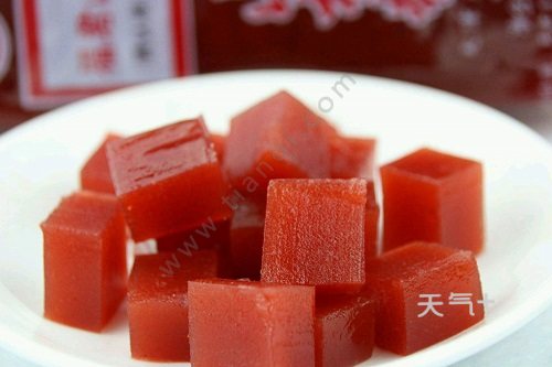 山楂糕是一种色泽红润,口感甜酸、爽滑细腻,老北京的传统糕点之一,在北京很多的商店都有卖,它不仅好吃,还具有很高的营养价值。山楂糕是用山楂果汁、白糖和琼脂作为主料制作而成,基本上老少咸宜。