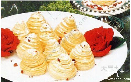 吴山酥油饼是浙江省杭州市特色传统名点,至今已有七八百年历史,号称“吴山第一点”。其色泽金黄,层酥叠起,上尖下圆,形似金山,覆以细绵白糖,脆而不碎,油而不腻,香甜味美,入口即酥。