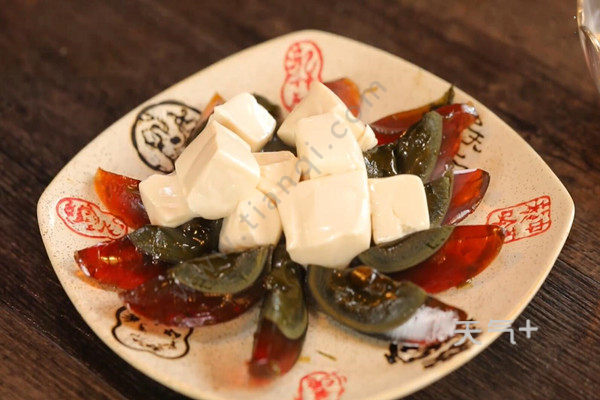 5、将豆腐块堆放到盘子中间,在四周围上切好的皮蛋;