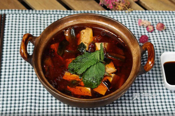 5、调入盐、白糖、鸡精、生抽拌匀,倒入砂锅,淋上炝好的干辣椒油,放上藿香叶即可。