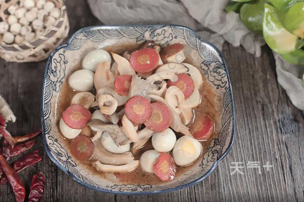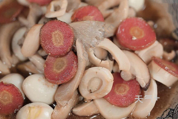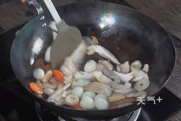 5、炒锅放油,油温6成热,鹌鹑蛋怎么做好吃 煮鹌鹑蛋的方法下胡萝卜煸炒1分钟,下冬笋香菇翻炒片刻,下鹌鹑蛋、平菇翻炒3分钟;
