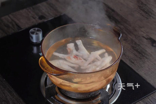 1、鸡爪剪去指甲,洗净对半切开冷水入锅,加料酒大火煮开,继续煮15分钟;