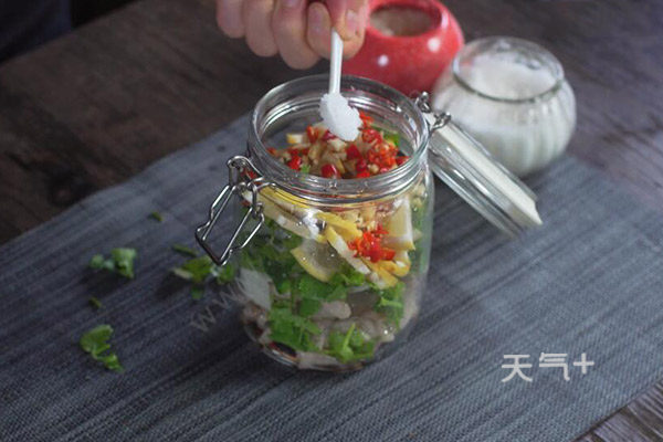 4、准备有盖容器,下鸡爪、洋葱条、香菜末、柠檬片、蒜末、辣椒末、生抽、醋、盐、糖拌匀;
