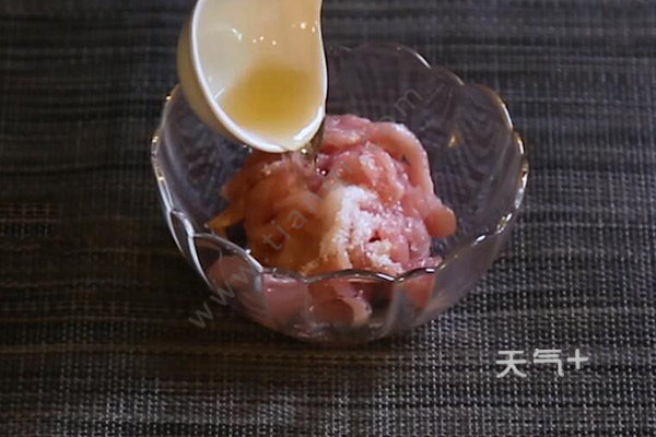 1、葱切葱花,猪里脊切丝,加入半勺盐、半勺料酒、1勺淀粉拌匀腌制5分钟;