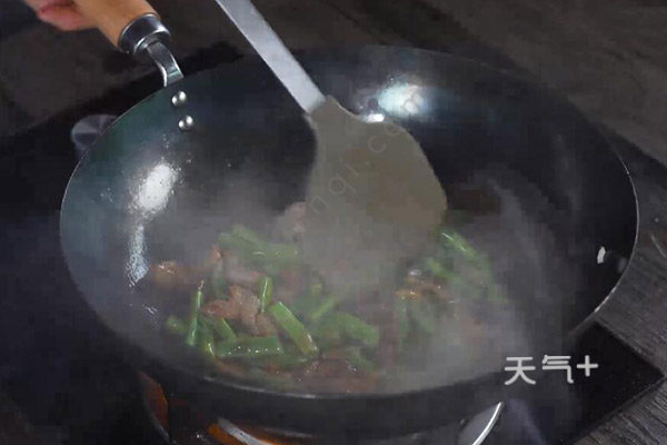 4、下豆角翻炒1分钟,加生抽、老抽翻炒30秒;