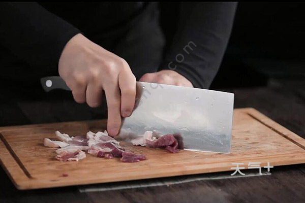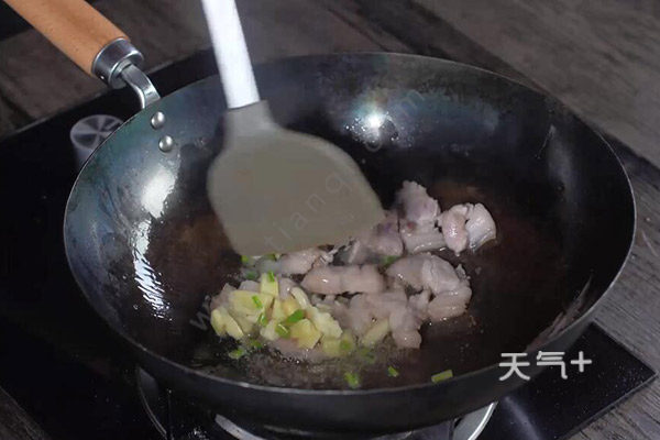 3、炒锅烧油6成热,炒至猪肉变色,放葱、姜、蒜炒香;