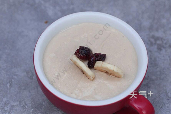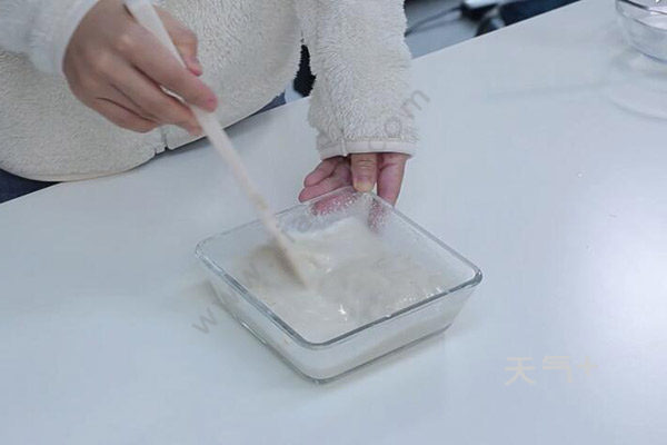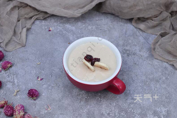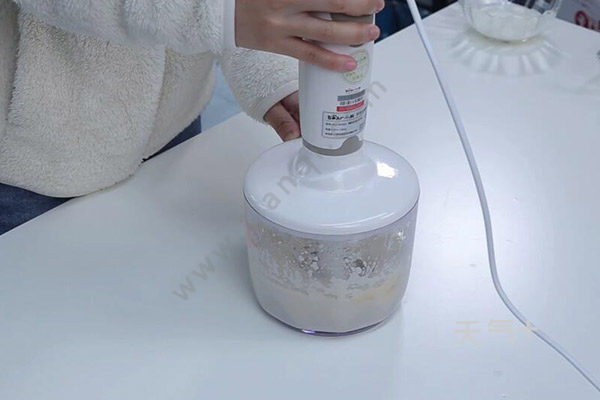 3、将吉利丁放入冷水中泡软备用,将牛奶液倒入香蕉豆腐泥中,搅拌至混合均匀;