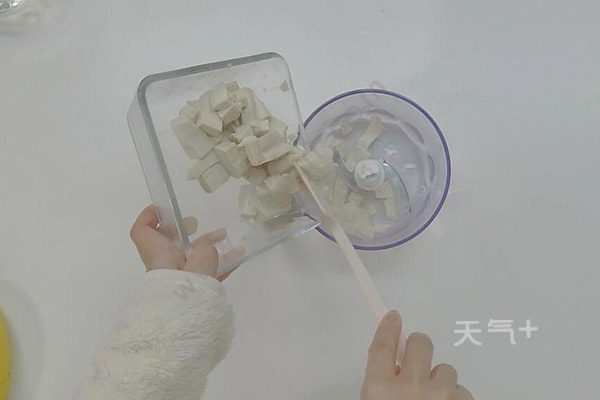 1、豆腐洗净切成小块,将豆腐放入水中,大火煮2分钟,沥干水分放入搅拌机;
