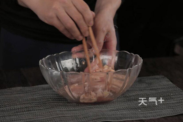 3、鸡腿去骨肉切丁,加入2汤匙料酒、1汤匙生抽、3片生姜拌匀腌制20分钟;