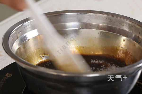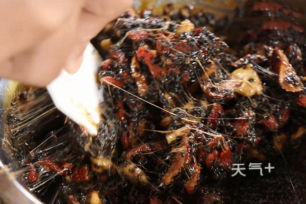 3、等黑芝麻加完以后呈拉丝状态即可起锅入模具;