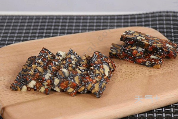 把用黄酒泡好的阿胶放入锅里烧开,转小火 熬10分钟左右,放入冰糖。熬半小时熬到挂旗状,依次放入核桃、红枣、枸杞、最后放入黑芝麻。等黑芝麻加完以后呈拉丝状态即可起锅入模具。待冷却后切片即可食用。