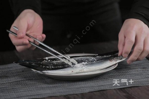 1、秋刀鱼洗净,两面抹上白醋、再撒上盐抹匀腌制30分钟;