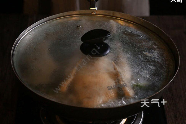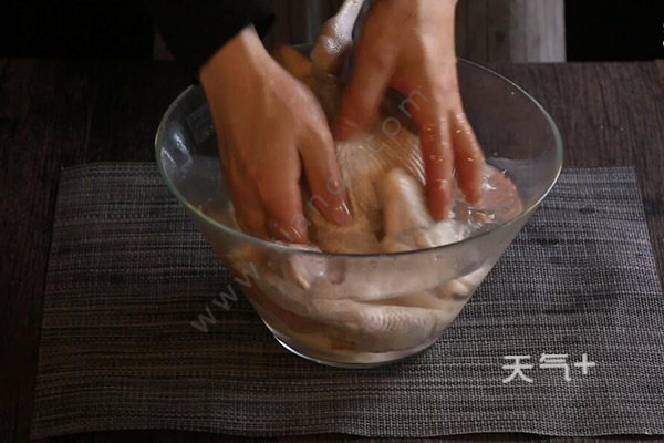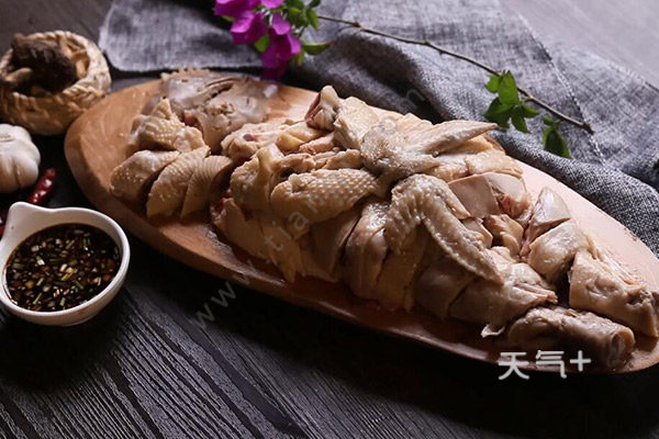 在煮鸡的过程中要几次控净鸡肚子里的水,为的是使鸡肉受热均匀。 主要是以热汤浸熟,肉才爽滑。