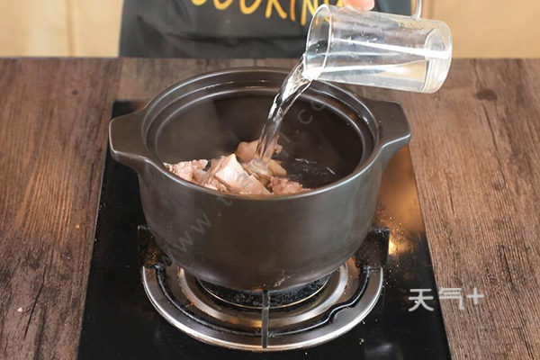 4、锅中放入姜片、鸡肉、清水适量炖煮1小时;