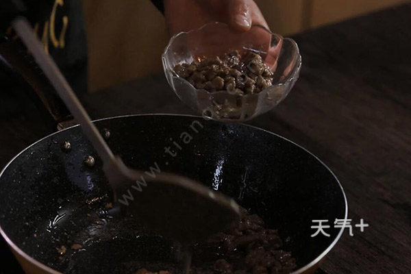 8、加入牛肉丁、葱花酱汁翻炒均匀即可。