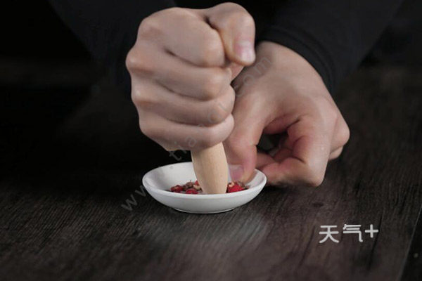 4、辣椒和花椒下无油热锅,小火煎至表面微焦,捣碎;
