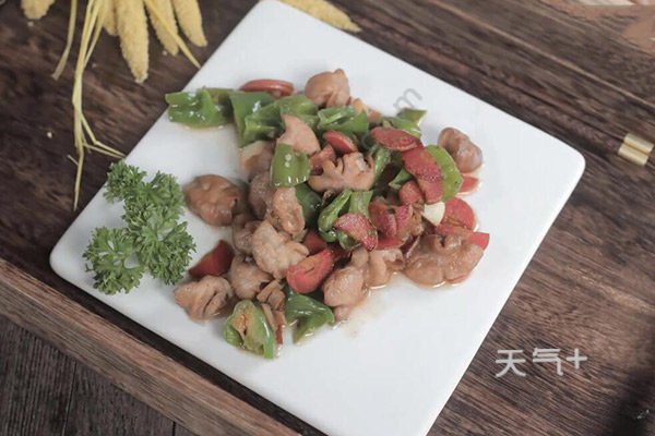 8、倒入肥肠爆炒,加入调料汁,调入盐、鸡精、白胡椒粉即可。