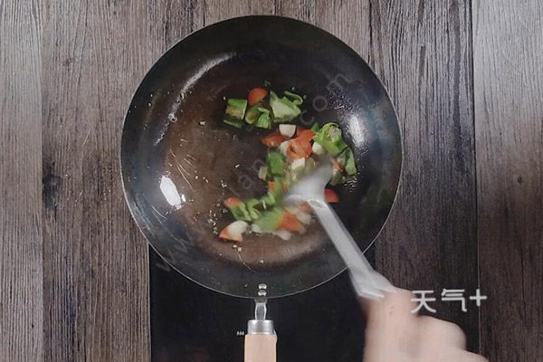 7、锅中留底油,爆香葱、姜、蒜,倒入青椒、胡萝卜炒匀;