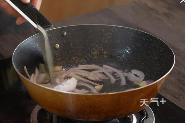 4、热锅冷油,放入姜、蒜片、洋葱丝炒匀;