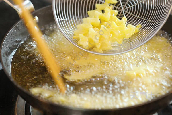 3、油温烧至7成热,放入土豆花炸至微黄,捞出沥干;