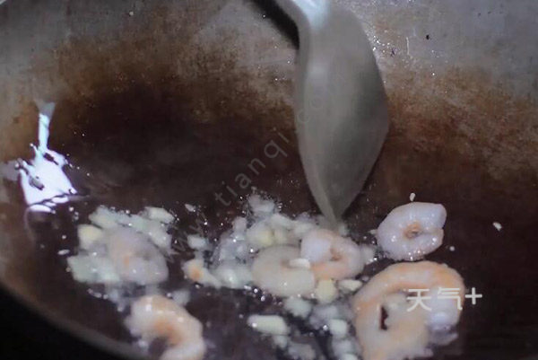 4、炒锅油温烧至6成热,炒香蒜、姜,倒入虾仁爆炒;