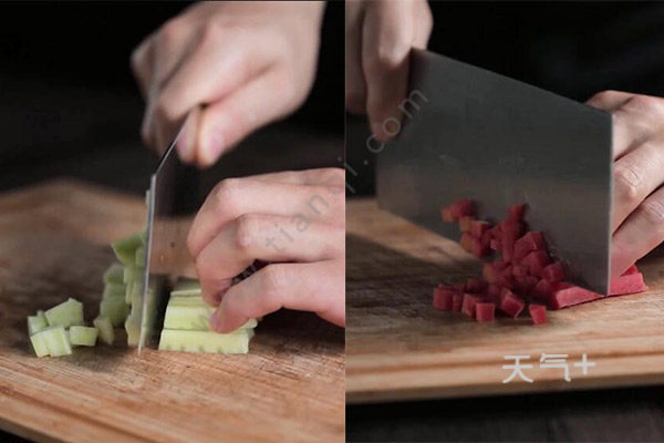 1、将黄瓜和胡萝卜去皮切丁备用;