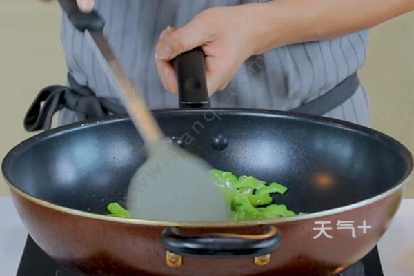 7、放入青椒丝,快速翻炒2分钟,最后调入盐、鸡精,炒匀即可。