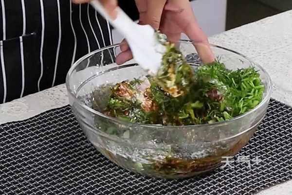 馅料:猪肉馅320克、鸡蛋1个、淀粉10克、茴香350克、糖10克、蚝油20克、盐6克、鸡精4克、老抽10克