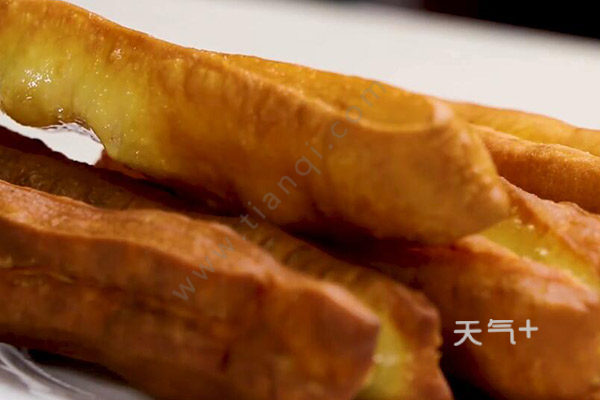 6、锅中油热,下油条生胚炸至金黄酥脆,早餐油条怎么炸 炸油条的家常做法即可捞出。