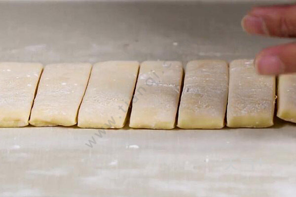 4、取出面团,压扁,擀成形成1cm厚度的面饼,再切成宽约3cm左右的面块;