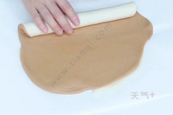 5、白糖面团和红糖面团擀开擀薄,红面团放在白面团上面,卷起,放入冰箱冷冻1小时;