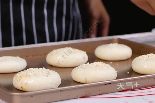 3、醒发好的面团分成小剂子,老北京糖火烧的制作方法 糖火烧怎么做正宗擀成间厚周边薄的面皮,放入糖馅,捏紧,擀成圆形饼状,撒芝麻;