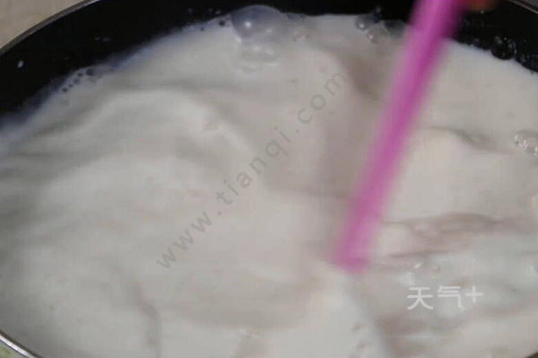 3、将杏仁奶中加入牛奶和泡好的琼脂,转小火加热,最后加砂糖,加热至琼脂和糖充分融化;