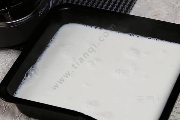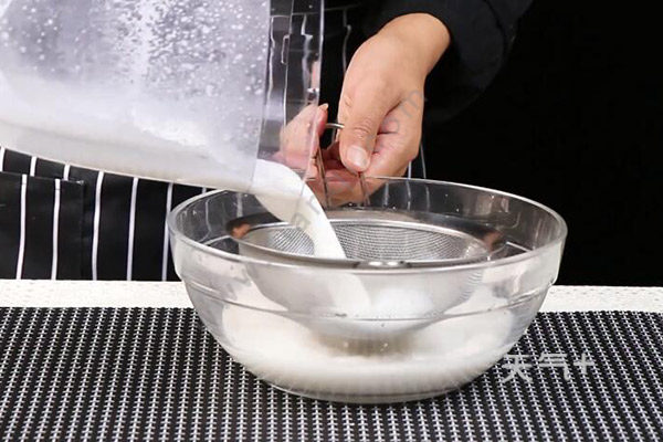 4、将杏仁牛奶过筛进容器里,再次过滤到一个方形容器里,冷藏1小时;