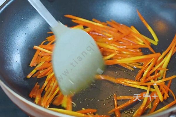 2、锅中倒入适量油,油温7成热,放入姜丝合胡萝卜丝,炒至断生;