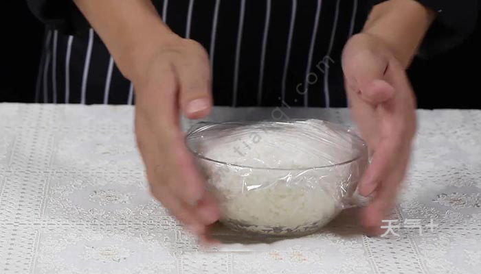 3、蒸熟的糯米盖上保鲜膜,自然放凉;
