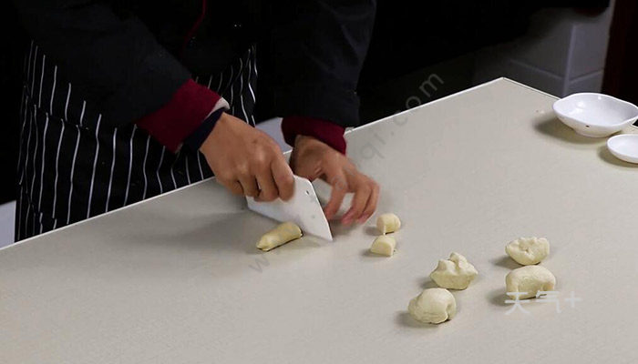 4、再将面团捏成五角形,用剪刀,把五个角都剪开一个小口,将小口往上翻成花瓣的形状;