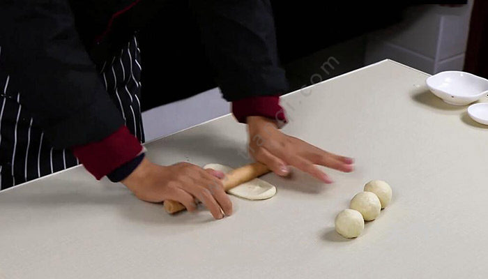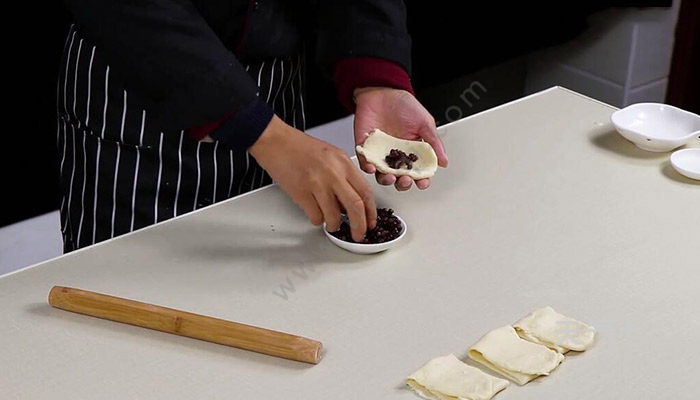 2、油皮包上油酥,封口,按扁,擀成长舌行,卷起;