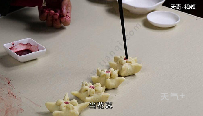 5、将多余的面团用红曲粉染色,取一小部分装饰在花瓣中间当花蕊;
