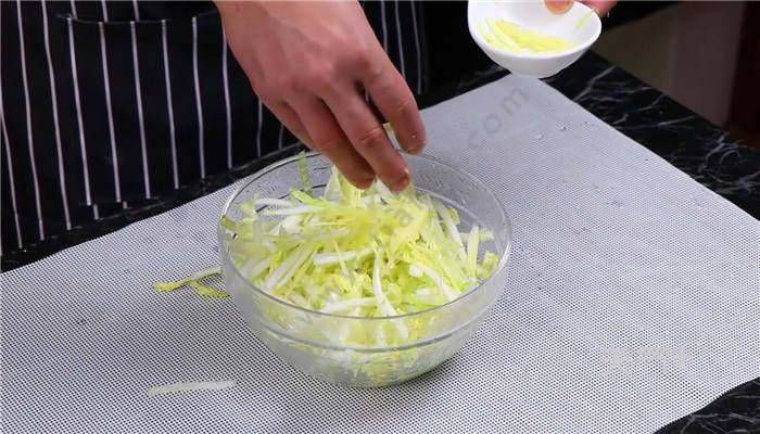 4、白菜放入盆中,加白糖、白醋搅拌均匀,撒上姜丝;