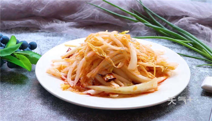 大白菜洗净,然后切成细条,加入适量盐腌制半天。将腌好的白菜挤干水分,放入清水中洗去咸味,再挤干水分备用。生姜去皮,切丝。白菜放入盆中,加白糖、白醋搅拌均匀,撒上姜丝。锅中倒适量油,放入干辣椒壳,炸出辣椒油。将炸好的辣椒油淋在白菜上,拌匀腌制2小时即可。