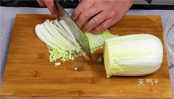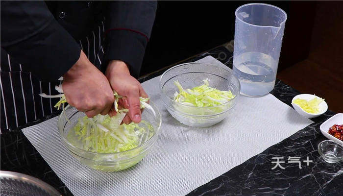 1、大白菜洗净,然后切成细条,加入适量盐腌制半天;