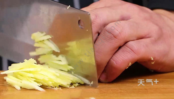 3、生姜去皮,切丝;