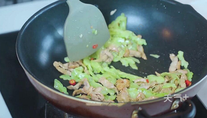 5、锅中留底油,放入蒜末、红椒圈炒出香味,放入苦瓜继续翻炒至断生,加入肉丝继续炒1分钟;
