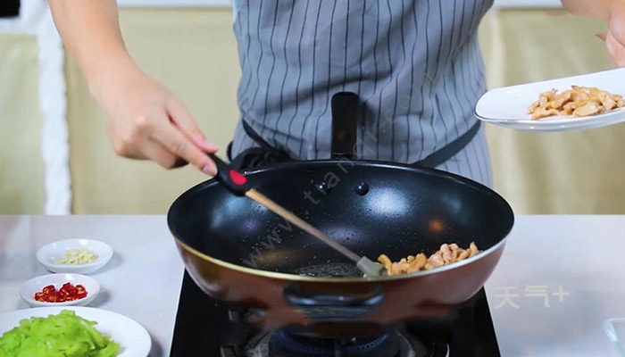 4、热锅下油,放入肉丝快速翻炒至变色后捞出;
