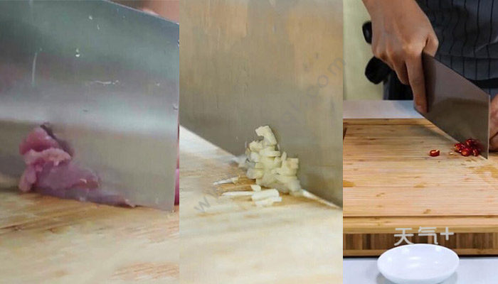 2、里脊肉洗净切丝,大蒜切末,红椒切圈;
