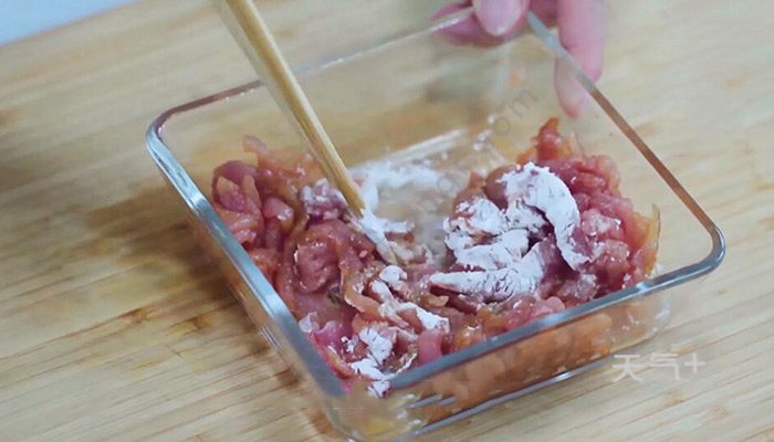 3、里脊肉放入碗中,加入生抽、料酒、淀粉,拌匀腌制5分钟;