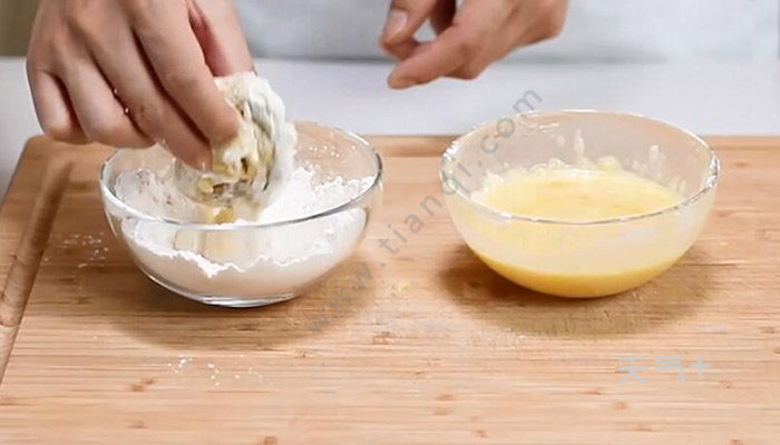 4、另取一个碗,放入面粉,鸡翅沾上蛋糊之后再裹上面粉。再沾第二次蛋糊、裹上第二次面粉;